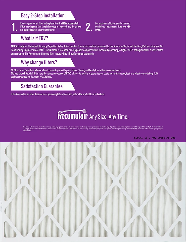 The Accumulair® Diamond is one of the highest efficiency Accumulair® filter on the market. Given an APR 1950 filter rating, this filter is a high efficiency filter that removes particulates measuring from 0.3 microns to 1.0 microns. This means that this filter removes a large variety of indoor air pollutants, including dust mites/particles, mold spores, pet dander, pollen, tobacco smoke, some viruses, and all bacteria. Accumulair® Diamond filters use electrostatic filtration, which uses a special synthetic filter media to attract particles. With a dust spot efficiency of 89-90%, the Accumulair® Diamond is more than 30 times more efficient than regular fiberglass filters and has a filter efficiency almost equivalent to a true HEPA filter.